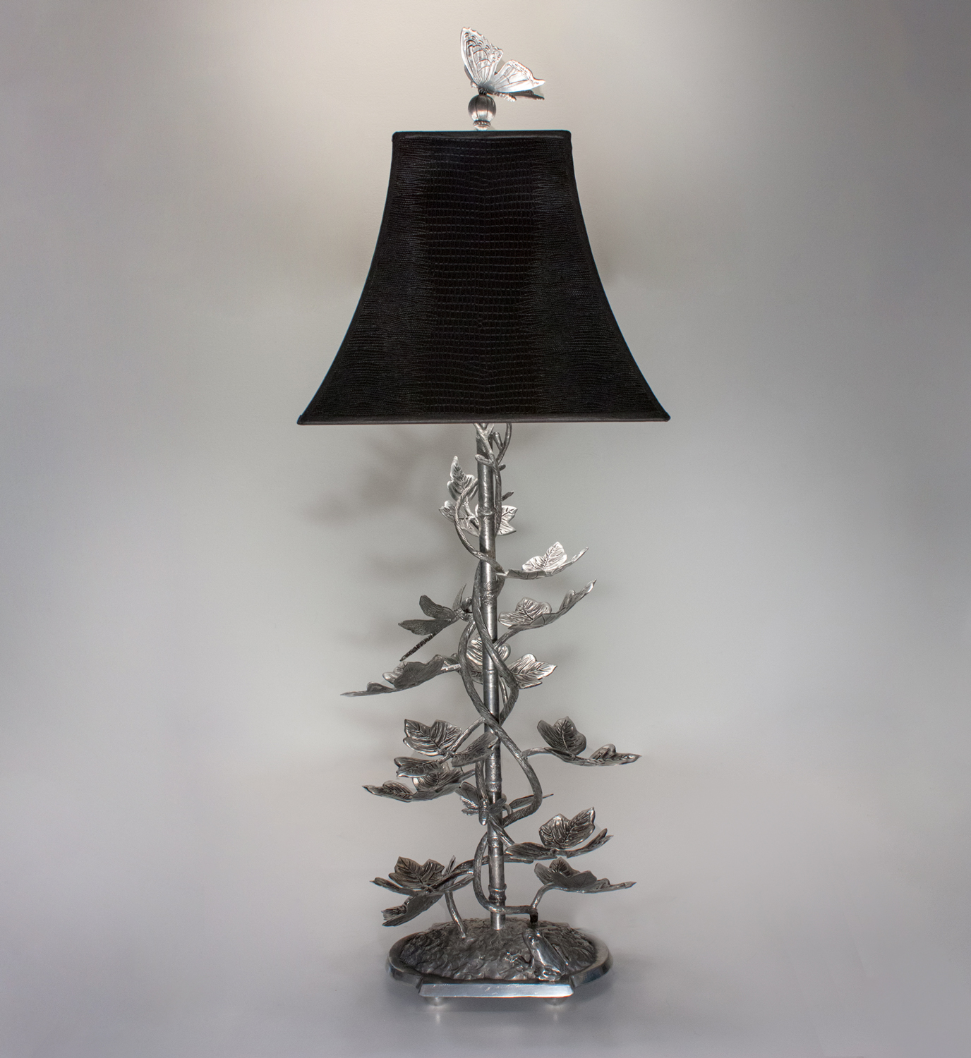 The version below is shorter and has a light shade. The base has a grasshopper and one of the leaves has a lizard and an inchworm.